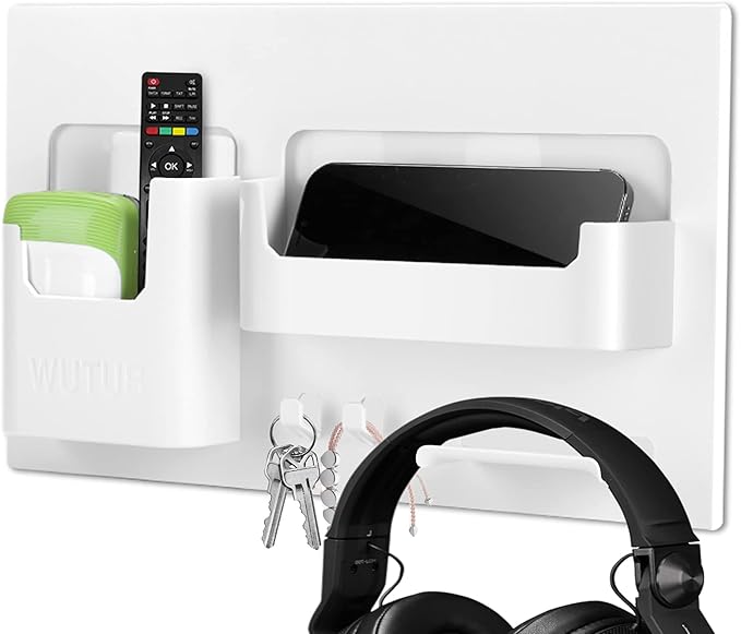- ✨【Next to Bed Wall Mounted Holder】 Stuck it next to the bed to hold your phone, TV & LED remotes, glasses, earbuds, earphones, tablets, and other accessories like jewelry you forget to remove before bed or hair ties. And best of all you can put snacks on there, LoL.